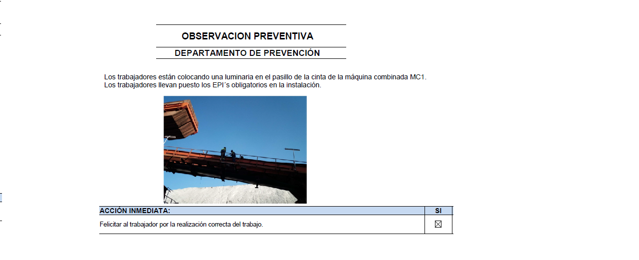 Acción inmediata: felicitar al los trabajadores por la realización correcta del trabajo y uso adecuado de los EPIS.